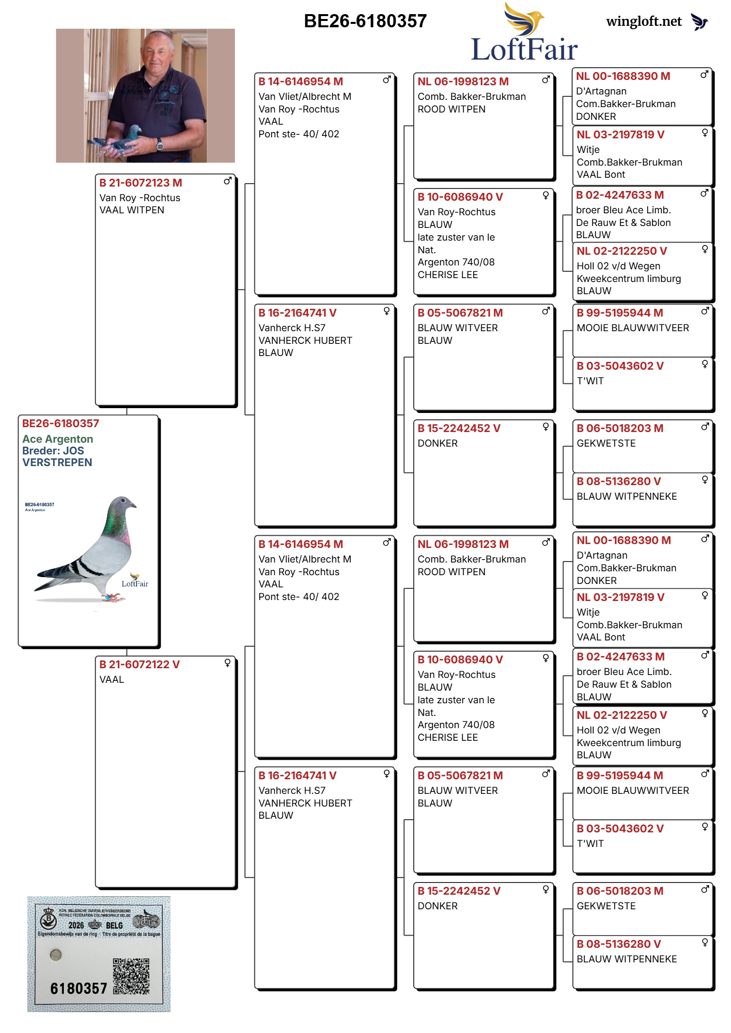 BE26-6180357 is not a “show pedigree” pigeon — it is a structured racing pigeon with breeding potential.