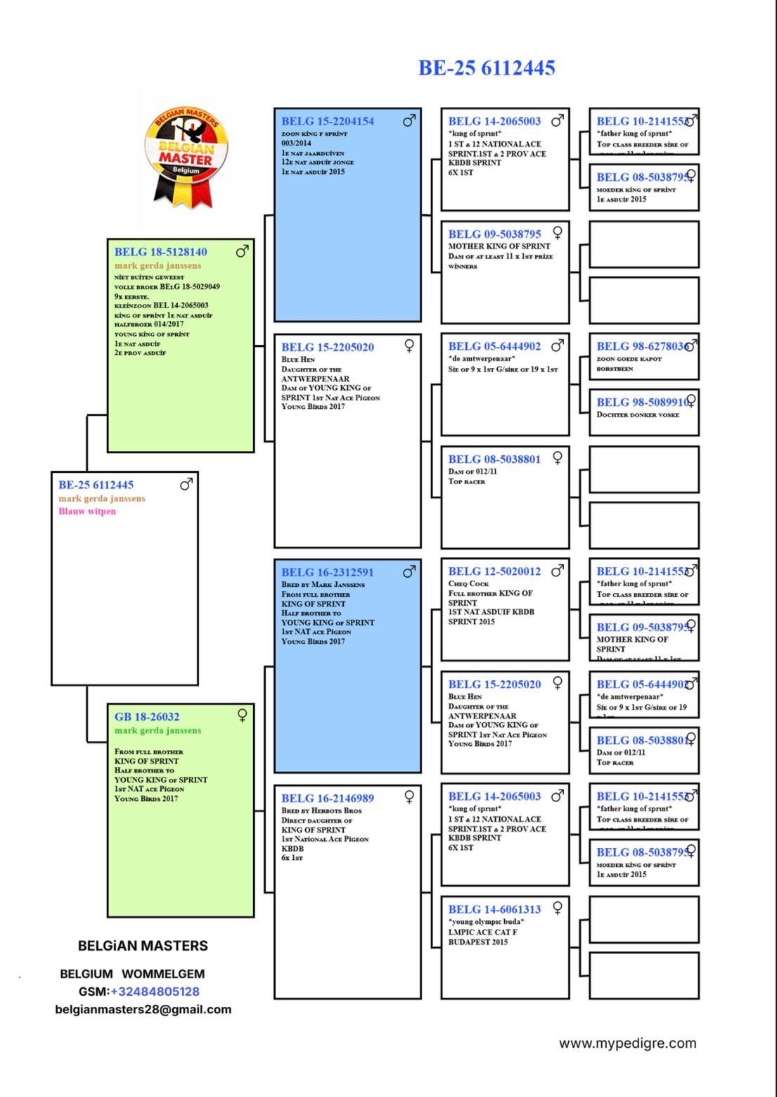On the sire side, we find BELG 18-5128140, a pigeon directly linked to: