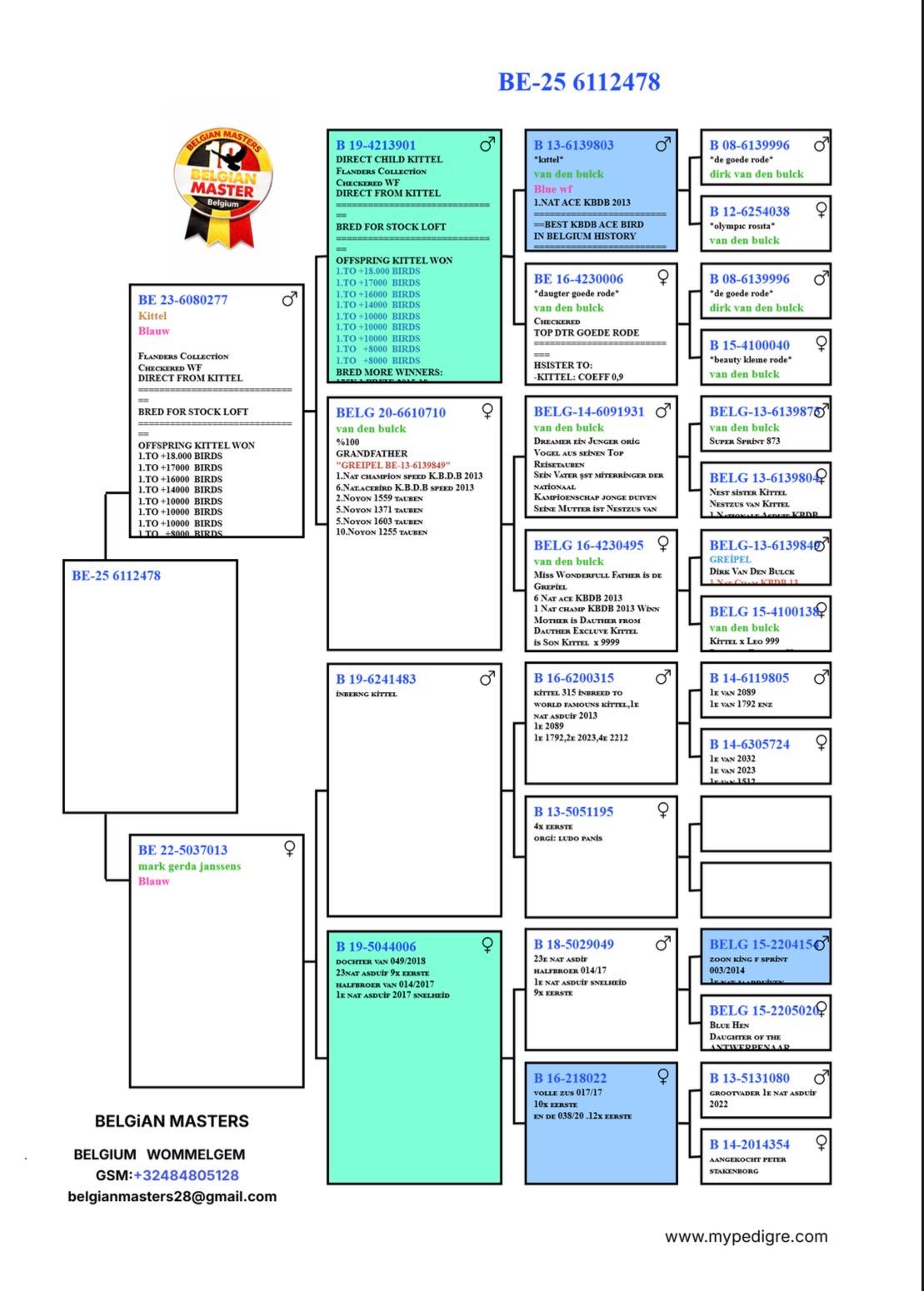 This pigeon is built on one of the most powerful sprint foundations in modern pigeon racing, combining the influence of Kittel (Van den Bulck) with a dam line packed with proven race results.