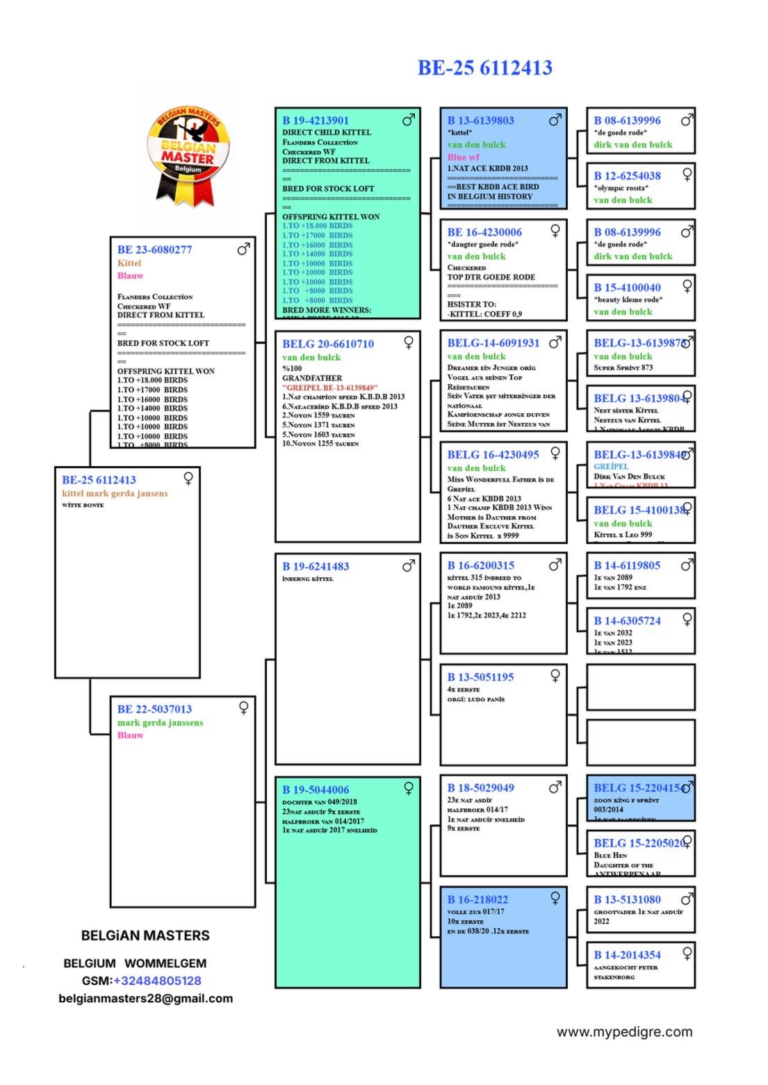 BE25-6112413 – Kittel Result 413 is therefore a serious breeding pigeon for fanciers who value not only famous names, but families that have already produced winners.
